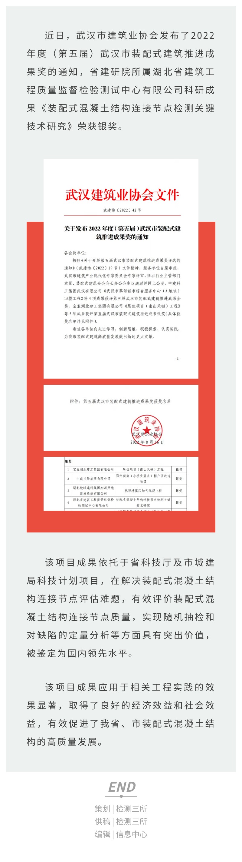 省建研院一项科研成果荣获武汉市装配式建筑推进成果银奖