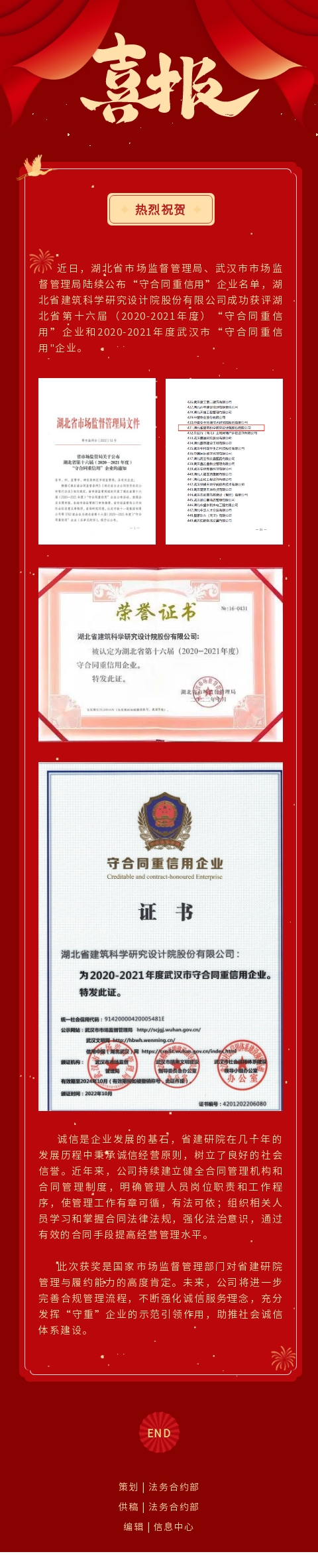 喜讯丨省建研院获评湖北省和武汉市“守合同重信用”企业